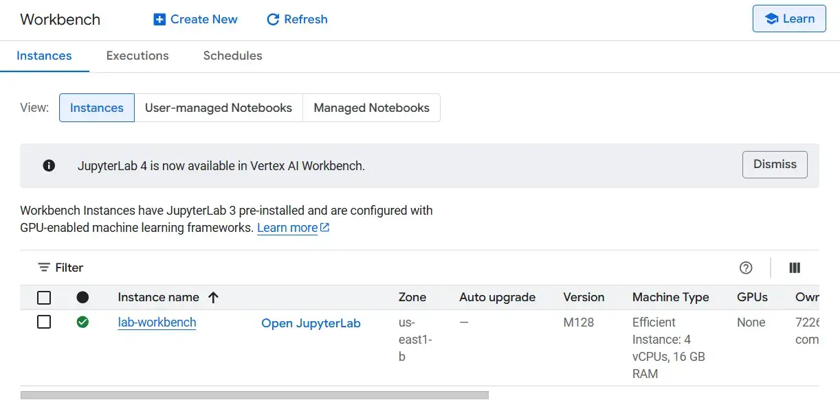 - 单击实例名称旁边的 Open JupyterLab。这将在浏览器的新标签页中打开 Jupyter Lab 界面。