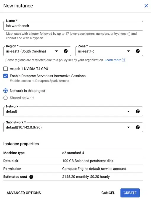 - 高级选项:如有需要,可通过选择机器类型或磁盘大小等选项自定义实例设置。