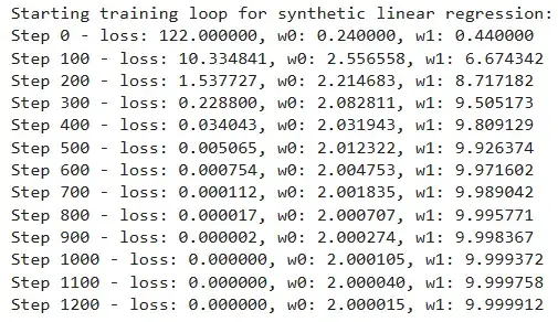 MSG = "Step {step} - loss: {loss:.6f}, w0: {w0:.6f}, w1: {w1:.6f}"
