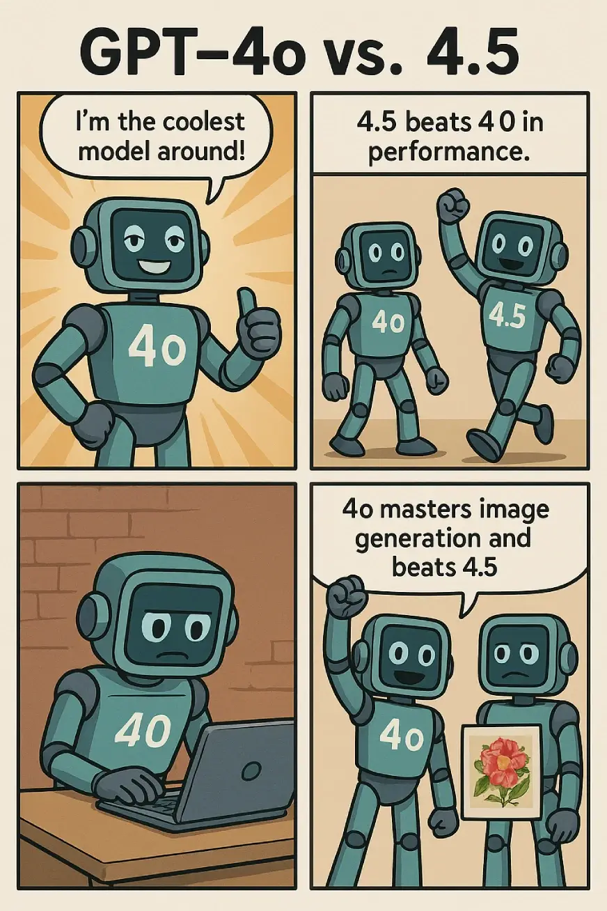 提示词:Create a 4-image story based on the following sequence:GPT-4o believes it’s the coolest model out there.GPT-4.5 arrives and surpasses GPT-4o in performance.GPT-4o puts in hard work to improve itself.GPT-4o becomes smarter by mastering image generation.