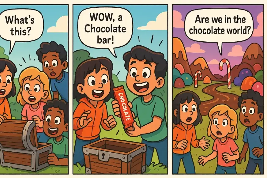 提示词:Generate a 3-part story of a group of kids unboxing a treasure, inside which is a new red coloured chocloate bar, which they eat and go to the chocolate world. Images should be 3D and in comic style. Add speech bubbles:1 – What’s this?2 – WOW, a Chocloate Bar3 (Suprised reaction in image) – Are we in the chocolate world.