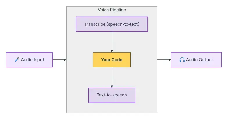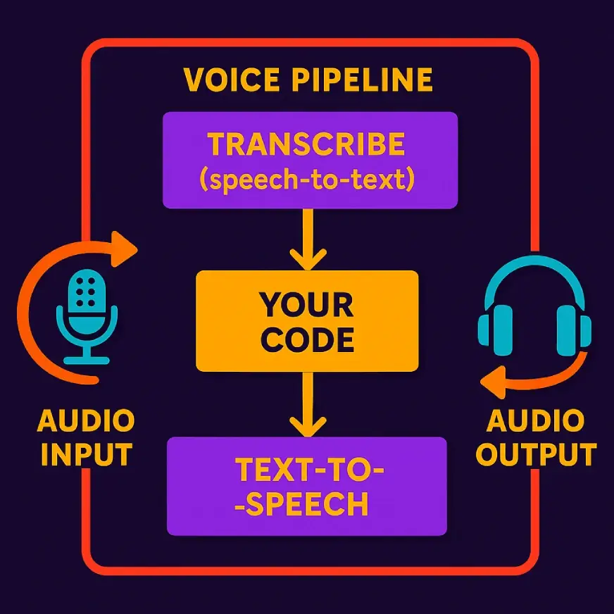 提示词:The image is of working of a voice agent. It has 3 main partSpeech-to-text (STT): Captures and converts your spoken words into text.Agentic logic: This is your code (or your agent), which figures out the appropriate response.Text-to-speech (TTS): Converts the agent’s text reply back into audio that is spoken aloud.Convert this basic image into vibrant image.