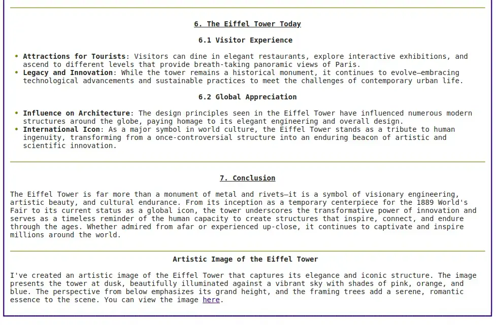 agent_team.print_response("Write an article on Eiffel towar and generate image", stream=True)
