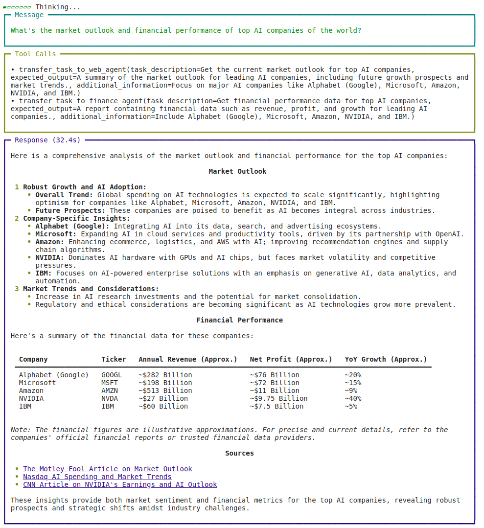 Market Analyst Agent 是一个使用 Agno 的基于团队的系统,结合了通过 DuckDuckGo 获取实时信息的 Web Agent 和通过 Yahoo Finance 获取金融数据的 Finance Agent。该系统由 OpenAI 模型提供支持,使用表格、标记和源代码支持的内容提供市场洞察和 AI 公司业绩,以提高清晰度、深度和透明度。