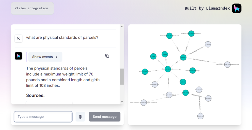 yFiles 通过动态可视化从后台的 LlamaIndex 知识图谱中获取的数据,无缝集成到用户界面中。每个节点代表关键信息,通过连接边可视化各种关系。