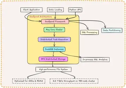 - Smallpond 是一个开源的分布式数据处理框架,使用 3FS 和 Ray 扩展了 DuckDB 的 SQL 功能。