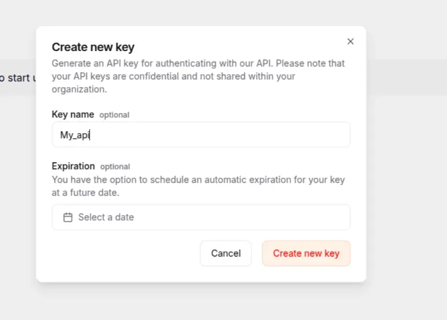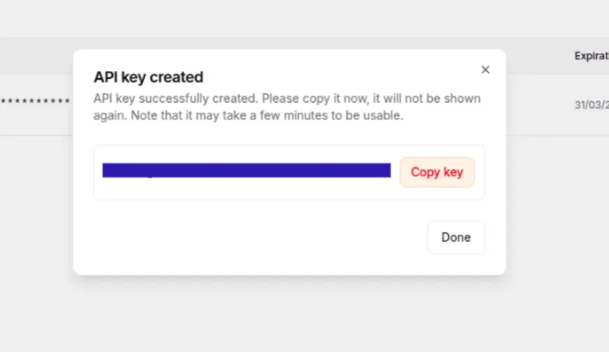 - 配置 API 密钥:提供一个密钥名称,以便于识别。您甚至可以选择设置有效期,以提高安全性。