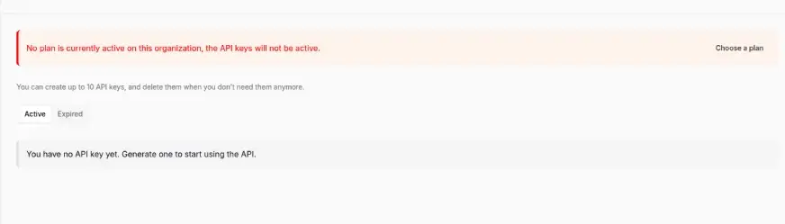 - 选择计划:当被要求生成 API 时,点击“Choose a Plan”以继续访问 API。