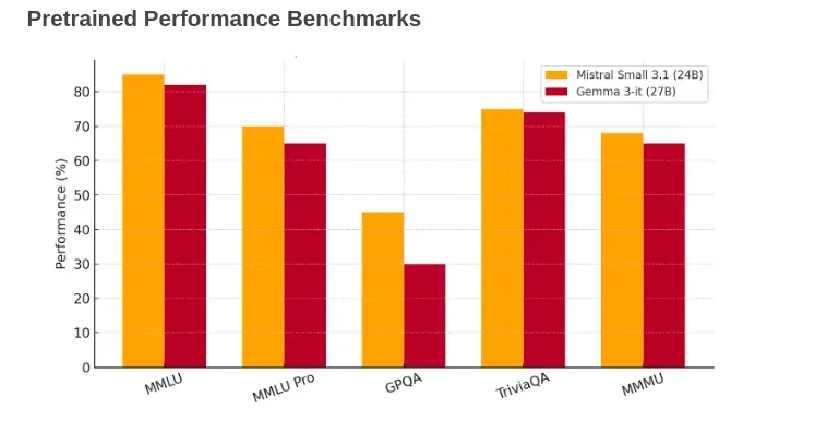 - 在大多数基准测试中,Mistral 3.1 始终优于 Gemma 3,尤其是在 GPQA Main、GPQA Diamond 和 MMLU 中。