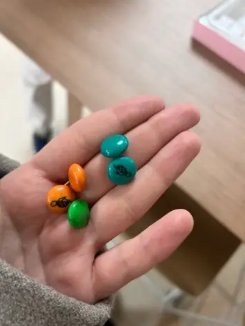| The candies in the image appear to be M&M’s, and the animal depicted on them is a turtle. The turtle design is visible on the blue, orange, and green candies. | Let’s analyze the candy in the image! The animal on the candy is a turtle. You can see the shell and the head and legs of a turtle clearly imprinted on the surface. |