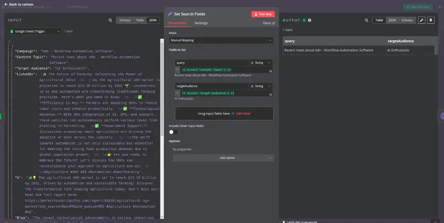 目标受众:{{ $(‘Set Search Fields’).item.json.targetAudience }} - 定义系统提示:提供高质量、特定平台内容的示例。