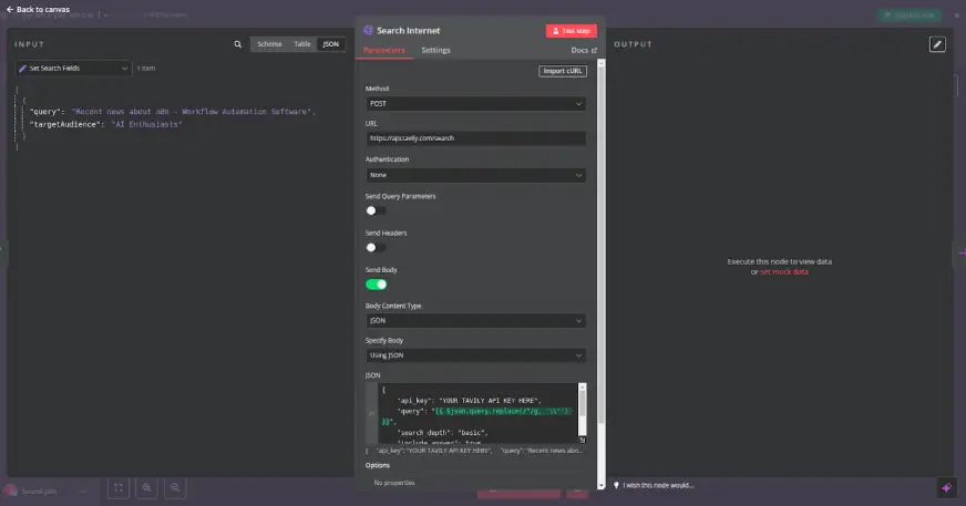 - 配置 API 凭据,通过以下 API 设置使用 Tavily 搜索节点: