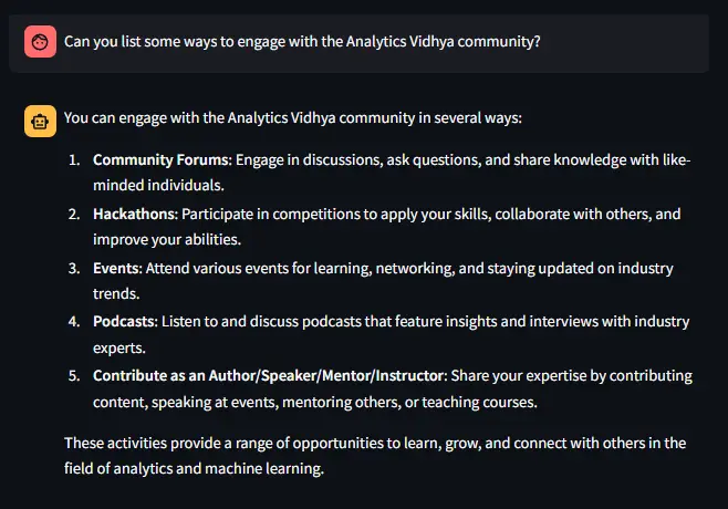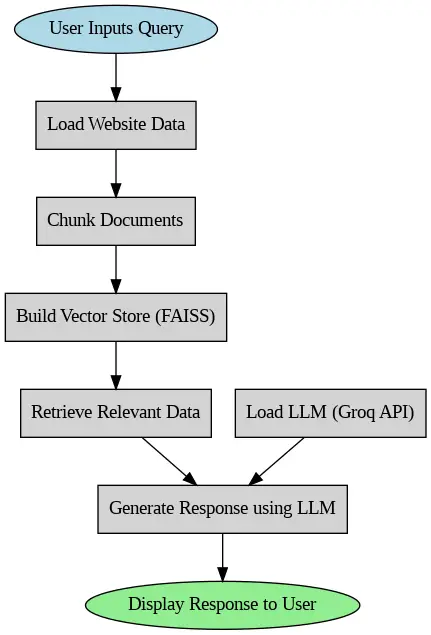 - 聊天机器人从 Analytics Vidhya 网站获取内容,对其进行处理,并将其存储到 FAISS 向量数据库中,以便快速检索。