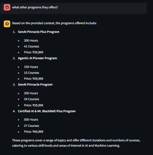 这段代码用于处理聊天机器人中的用户输入、检索和回复生成。当用户输入信息时,信息会存储在 st.session_state.conversation 中,并显示在聊天界面上。聊天机器人使用 qa_chain.invoke({“input”: user_input}) 处理查询时,会出现一个加载旋转器,该旋转器会检索相关信息并生成回复。助手的回复是从回复字典中提取的,确保在找不到回复时有一条后备信息。最后,助手的回复将被存储和显示,以保持流畅的交互式聊天体验。
