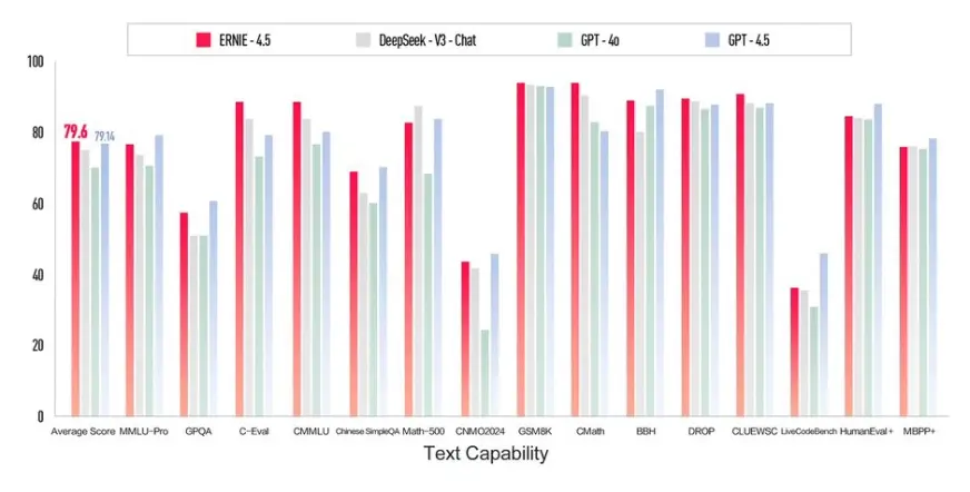 - ERNIE 4.5 的平均得分是 77.77,高于 GPT-4o 的 73.92。