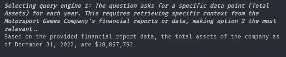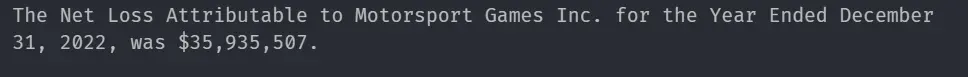 response = query_engine.query( "what is the Net Loss Attributable to Motossport Games Inc. on 2022 Year Ended December 31?" ) print(str(response))