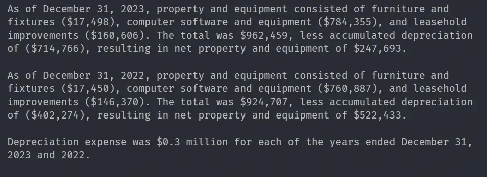 response = query_engine.query( "Summarise Property and equipment consist of the following balances as of December 31, 2023 and 2022 of the company with financial data?" ) print(str(response))