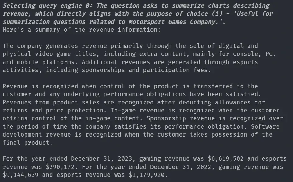 response = adv_query_engine.query( "Summarize the charts describing the revenure of the company." ) print(str(response))