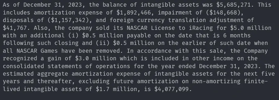 response = query_engine.query( "Summarise The Intangible Assets on December 21, 2023 of the company with financial data?" ) print(str(response))