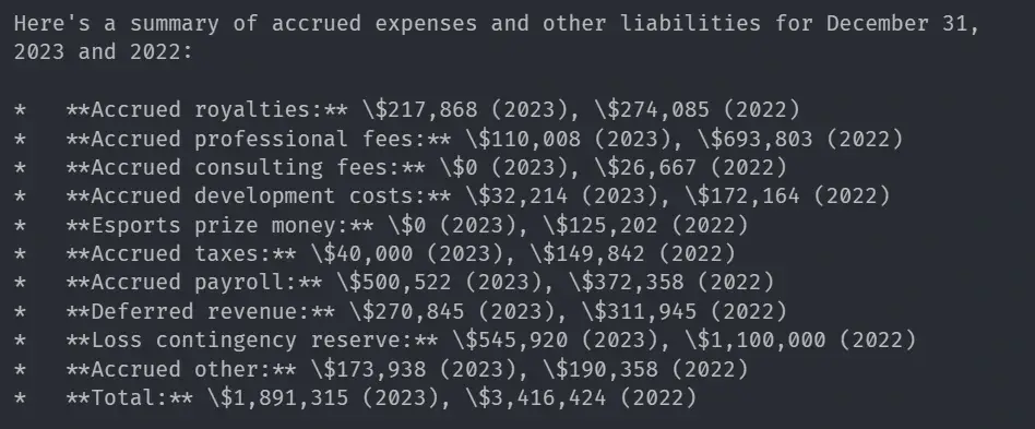 response = local_query_engine.query( "Summary of chart of Accrued expenses and other liabilities using the financial data of the company" ) print(str(response))
