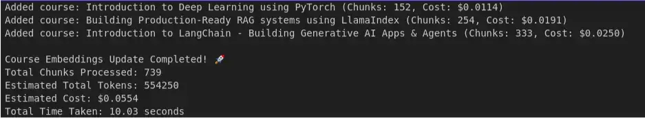 在这一部分,我们将详细介绍将课程字幕存储到 ChromaDB 的过程,包括文本分块、嵌入生成、持久化和成本估算。
