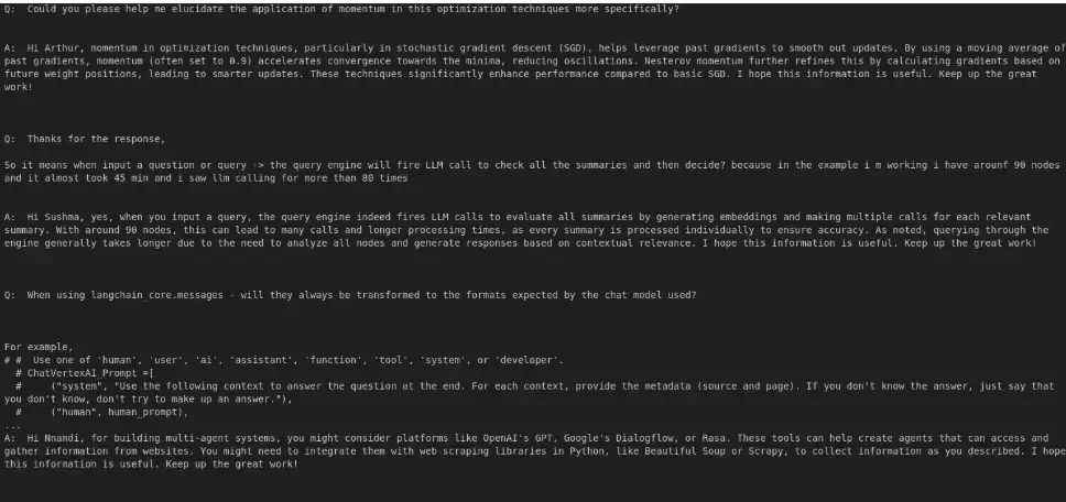 下面的代码使用人工智能代理处理存储在 CSV 文件中的学习者查询并生成回复。它首先加载包含学员查询、课程详情和讨论线程的数据集。reply_too_query 函数会提取相关详细信息,如学员姓名、课程名称和当前查询。如果存在以前的讨论,则会检索这些讨论的上下文。如果查询包含图片,则会跳过。然后,该函数会从 ChromaDB 获取相关课程资料,并将查询、相关内容和过去的讨论发送给人工智能代理,以生成结构化的回复。