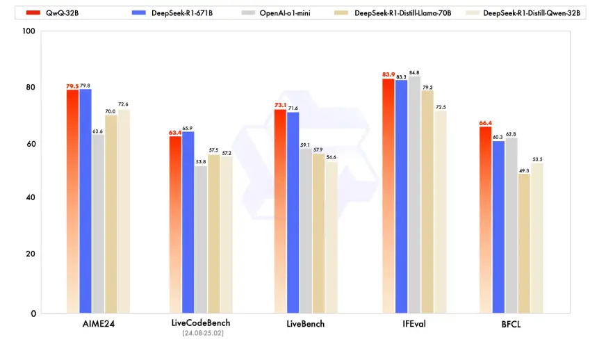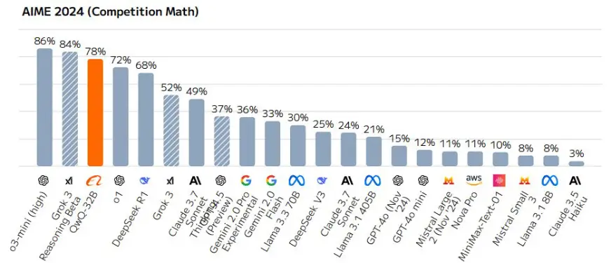 阿里巴巴的 QwQ-32B 在 GPQA Diamond 中的科学推理得分率为 59%,在 AIME 2024 中的数学得分率为 86%。与顶级模型相比,它的数学成绩优秀,但科学推理能力落后。