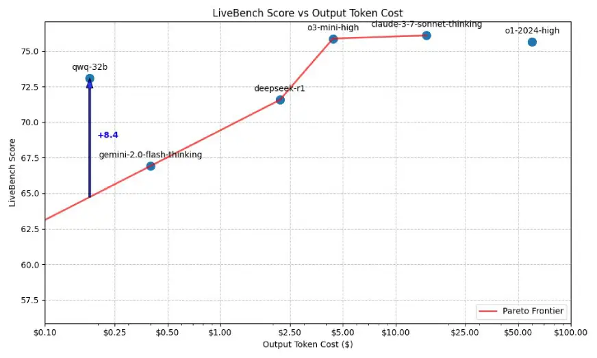 QwQ-32B 代表了人工智能推理模型的一次重大飞跃,其性能可与 R1 和 o3-mini 等顶级模型相媲美,而成本却只是它们的一小部分。其令人印象深刻的 LiveBench 分数和成本效益(每个输出令牌的价格仅为 0.18 美元)使其成为各种应用的实用和便捷之选。这一进步彰显了高性能人工智能变得更加经济实惠和可扩展的潜力,为该领域更广泛的应用和创新铺平了道路。