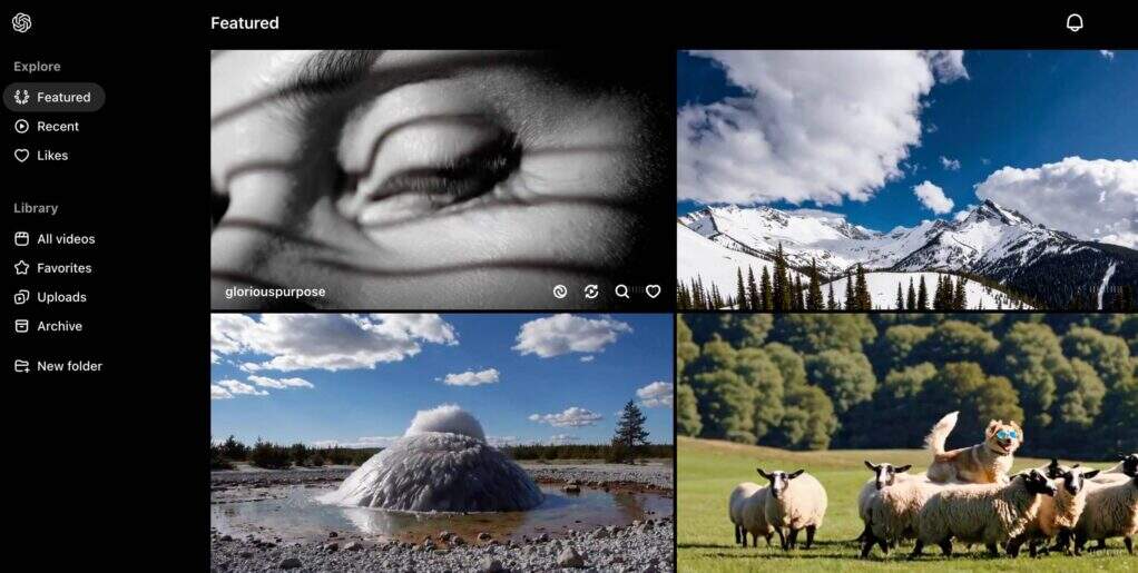 首次登录 Sora 时,您会被引导至“Featured”页面。在这里,您可以浏览用 Sora 制作的视频展示。如果您之前已经使用过 Sora,则会进入“Library > All Videos”页面,其中包含您之前创建的所有视频。