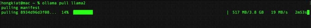 ollama pull llama2 由于 LLM 是相当大的文件,因此下载需要一些时间–根据你的网速,可能需要几分钟或更长时间。