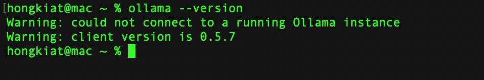 注意:如果你看到“Warning: could not connect to a running Ollama instance”(警告:无法连接到正在运行的 Ollama 实例)的信息,请不要担心!这很正常,因为我们还没有启动 Ollama。只要看到类似“client version 0.5.7”的信息,就可以开始了。