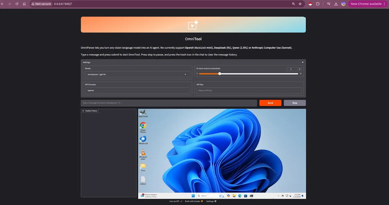 python app.py -windows_host_url localhost:8006 -omniparser_server_url localhost:8000 - 打开终端中显示的 URL,输入 API 密钥,然后开始与 AI 代理交互。