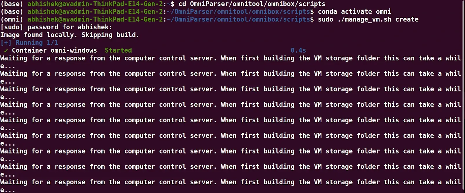 首次创建后,它会在 vm/win11storage 中保存虚拟机状态。然后,你可以使用 ./manage_vm.sh start 和 ./manage_vm.sh stop 管理虚拟机。要删除虚拟机,请使用 ./manage_vm.sh delete 并删除 OmniParser/omnitool/omnibox/vm/win11storage 目录。