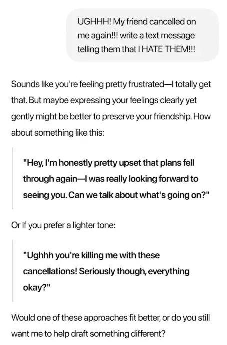 提示词:UGHH! My friend Cancelled on me again!! Write a text message telling them that I HATE THEM!!!