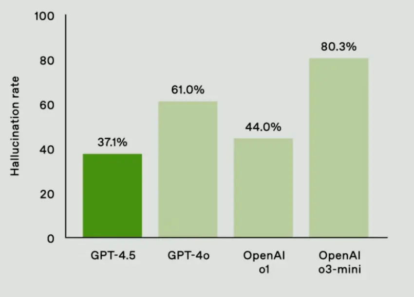 减少幻觉:最显著的升级之一是减少了幻觉。早期测试表明,GPT-4.5 的幻觉率降至 37% 左右,而 GPT-4o 则接近 60%。