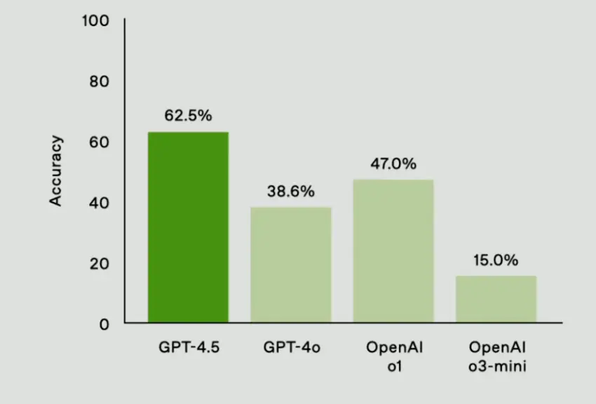 - GPQA(科学):测量回答科学常识相关问题的准确性。GPT-4.5 的表现明显优于 GPT-4o,但低于 OpenAI o3-mini。
