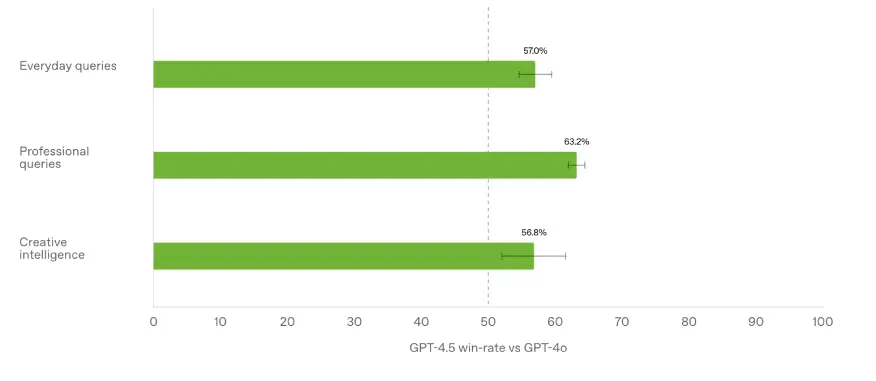 在实际应用中,GPT-4.5 也被证明优于 GPT-4o。人类测试人员对 GPT-4.5 和 GPT-4o 的比较评估显示,人们更倾向于新模型。