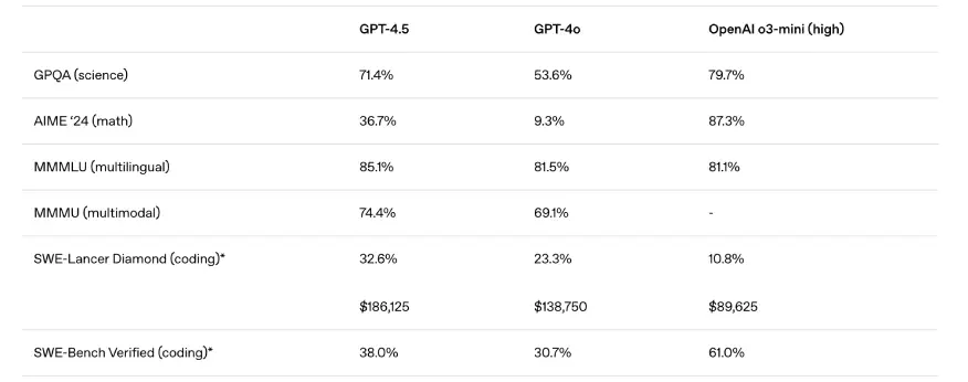 上面我们看到了该模型在某些任务中的表现,现在让我们看看其性能数据如何。下面是 GPT-4.5、GPT-4o 和 o3-mini 之间的基准比较。
