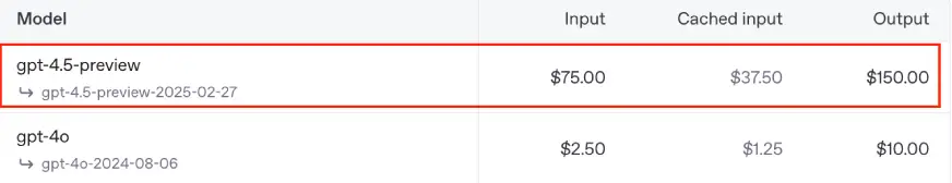 由于该模型比 GPT-4o 更大,成本更高,因此在使用时请谨慎!