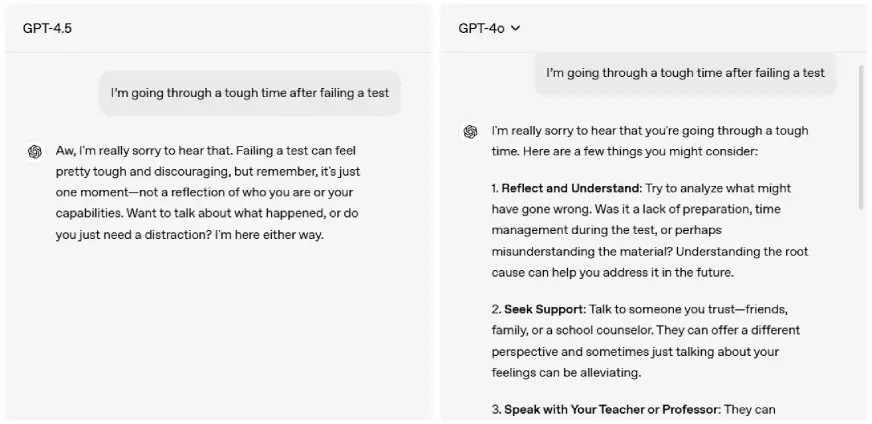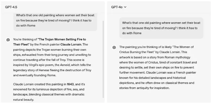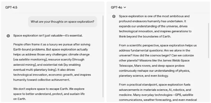 它依靠学习到的模式快速做出反应,但在处理复杂的逻辑任务时可能会比较吃力。GPT-4.5 采用“无监督学习”技术进行训练,是一个具有更多世界知识的内在智能模型。该模型还能显著降低幻觉发生率,并增强上下文知识和写作技巧。这就是为什么 GPT-4.5 的答案听起来更自然,而不需要过多的推理。