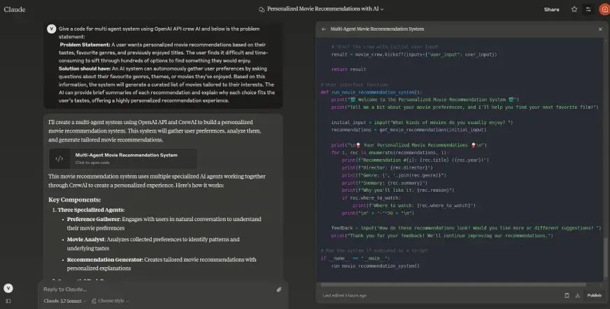 本任务旨在评估 Claude 3.7 Sonnet 生成文档完备、可读性强且可维护代码的能力。我们将要求该模型建立一个多代理系统,根据用户的口味、最喜欢的类型和以前喜欢的影片提供个性化的电影推荐。由此产生的人工智能系统应与用户互动,收集他们的喜好,并将其作为输入,生成一份精心策划的推荐列表。