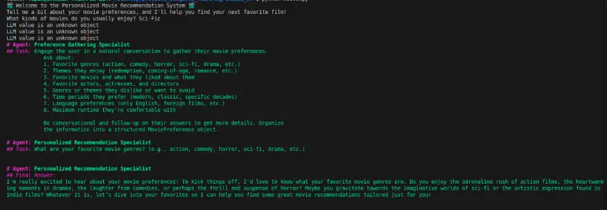 然而,在多代理系统后半部分的 generate_recommendations 函数中出现了一个问题,它返回的是图元而不是电影推荐对象。这导致在尝试访问标题等属性时出现属性错误(AttributeError),因为元组不支持点符号。预期数据格式和实际数据格式之间的这种不匹配会导致在迭代推荐列表时出现错误。