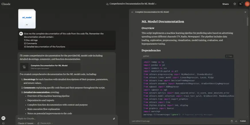 现在让我们看看 Claude 3.7 sonnet 在代码文档方面有多出色。在这项任务中,模型需要从生成的代码中提取全面的文档。这包括函数和类的文档说明、解释复杂逻辑的行内注释,以及函数行为、参数和返回值的详细说明。