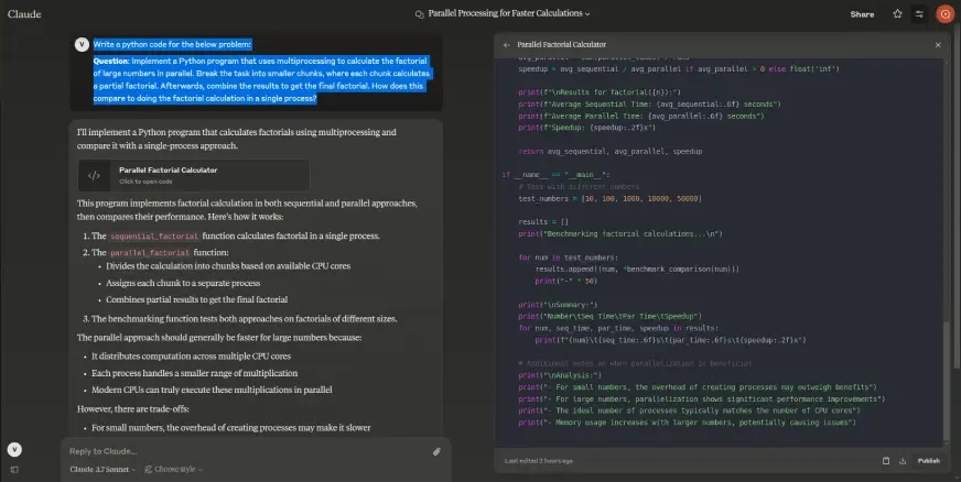 在这项任务中,我们将要求 Claude 3.7 Sonnet 使用多进程并行执行一个计算大数阶乘的 Python 程序。该模型将把任务分解成若干小块,每块计算一个部分阶乘。然后,它将合并计算结果,得出最终阶乘。将对照单进程阶乘计算来分析这种并行执行的性能,以衡量效率的提高。这样做的目的是利用多进程来减少复杂编码任务所需的时间。