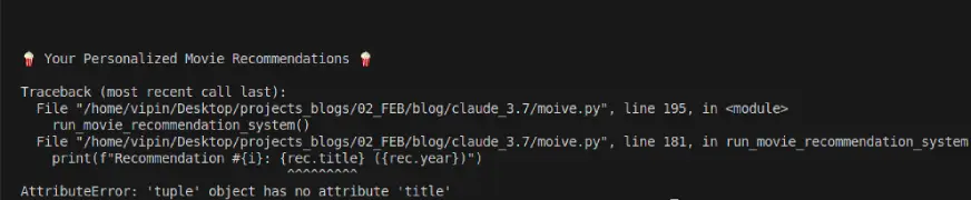 出现错误的原因是推荐包含元组而非 MovieRecommendation 对象。代码假定 rec 具有标题、年份和导演等属性,但由于它是一个元组,访问 rec.title 会导致属性错误。