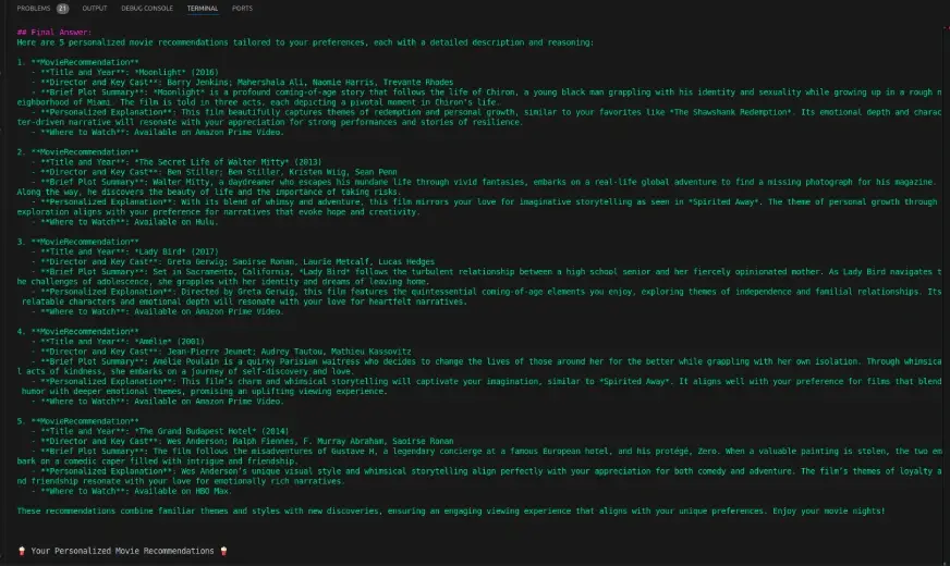 多代理电影推荐系统结构良好,利用 CrewAI 明确定义了代理角色和任务。然而,generate_recommendations() 中的一个问题导致它返回的是图元而不是电影推荐对象,从而导致在访问标题等属性时出现属性错误(AttributeError)。这种数据格式不匹配会扰乱迭代,需要更好的处理方法来确保正确的输出。