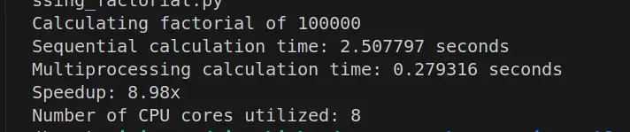 这个 Python 程序使用多进程有效地计算了大阶乘,通过 multiprocessing.Pool() 将任务分成若干块,并将它们分配给不同的 CPU 内核。并行阶乘(parallel_factorial())函数会分割计算范围,分别处理每个分块并合并结果,而顺序阶乘(sequential_factorial())函数则在单个循环中进行计算。该方法大大缩短了计算时间,但可能面临内存限制和进程管理开销。代码结构合理,可动态调整 CPU 使用率,并包含针对潜在溢出的错误处理。