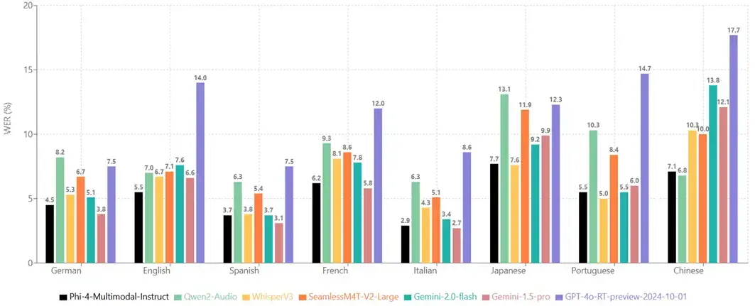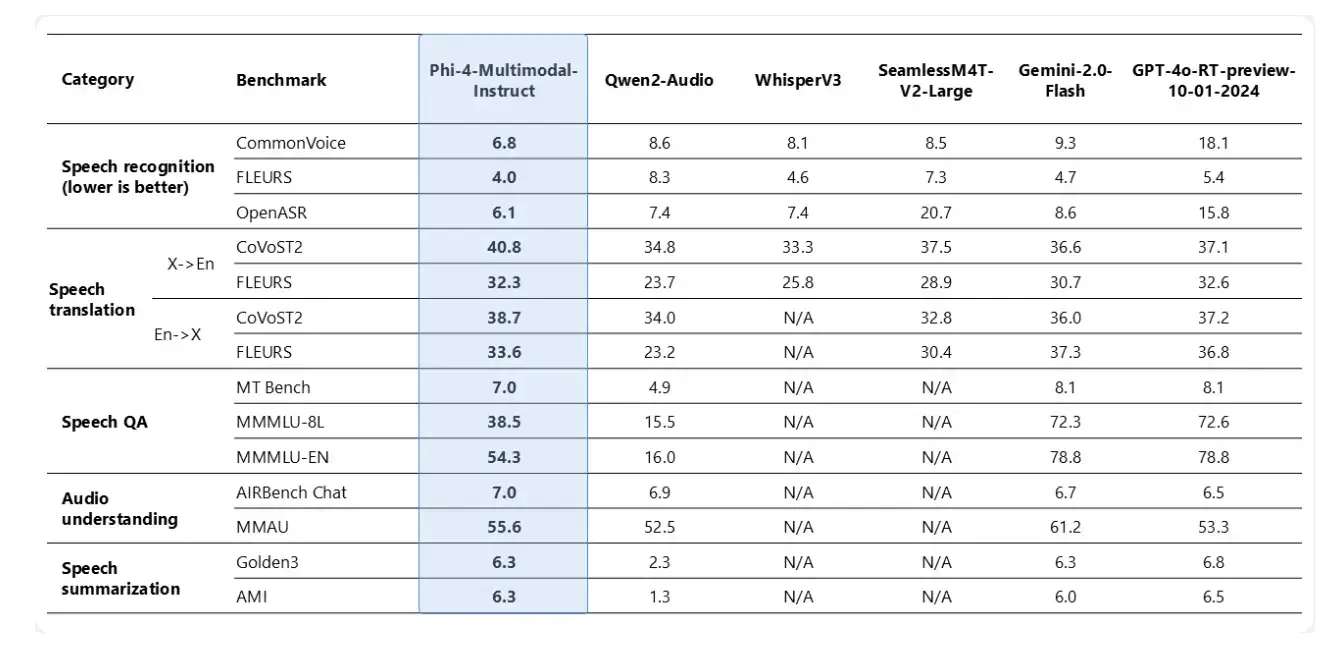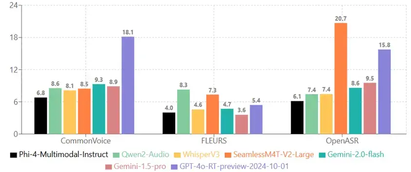 - Phi-4-Multimodal-Instruct 在语音识别方面表现出色,在 FLEURS、OpenASR 和 CommonVoice 中击败了所有竞争对手。