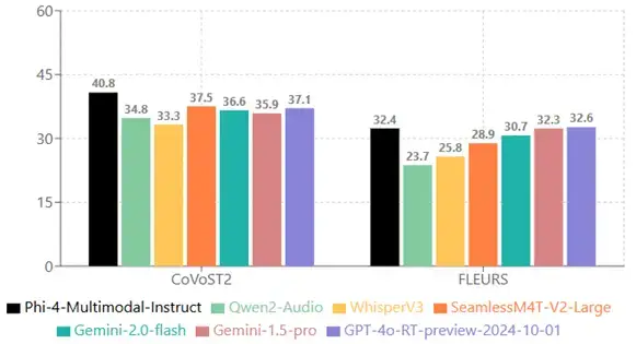 - Phi-4 在语音翻译方面表现不佳,不如 WhisperV3、Qwen2-Audio 和 Gemini 模型。