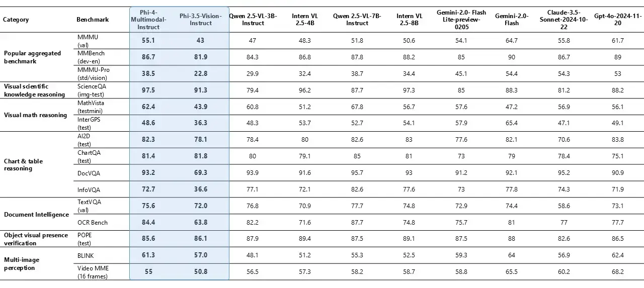 - Phi-4-multimodal-instruct(68.9)的表现优于InternOmni-7B (53.9)和Gemini-2.0-Flash-Lite (62)。